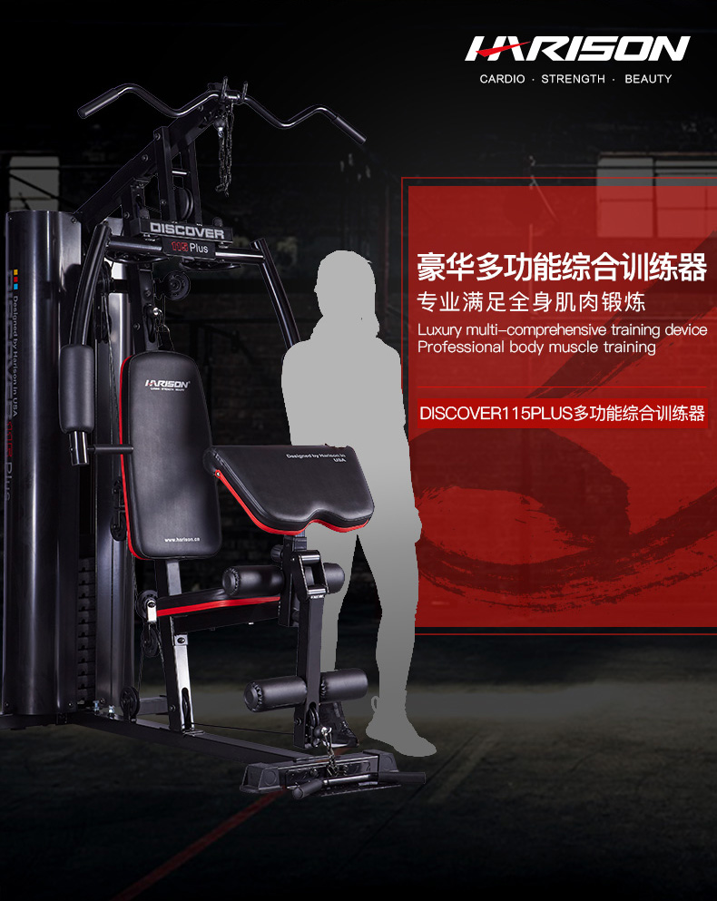 HARISON 综合训练器 Discover -115PLUS 有50*70MM管材,承重可达300kg,配重12块,可达72kg。